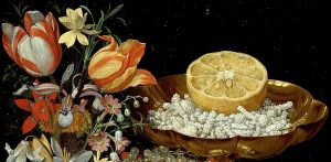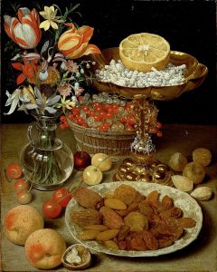 Das in diesem Dessertstillleben dargestellte Zuckerwerk ist zur damaligen Zeit also eine ebensolche Kostbarkeit wie die Zitrone oder die goldene Schale. Eine Zitrone kostete so viel, wie ein Handwerker an einem Tag verdiente.