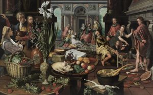 In diesen – man kann sagen: revolutionären – Bildern aus der Mitte des 16. Jahrhunderts wird diese jahrhundertelange Bedeutung gänzlich umgedreht. Im Vordergrund steht eindeutig das Körperliche, die Küche, das Essen, die irdischen Dinge. Die Nahrung des Körpers hat in diesen Darstellungen einen deutlich größeren Stellenwert als geistige Belange. Und nicht nur das: auch das Religiöse wird zurückgedrängt, die Szene aus dem Lukas-Evangelium ist nur mehr winzig klein im Hintergrund zu sehen. Sie wirkt eher wie eine Dekoration.