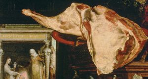 Und im Zentrum dieser Bilder stehen die Fleischstücke. Sie symbolisieren gemeinsam mit den anderen dargestellten Lebensmitteln den körperlichen Bereich: die bürgerliche Küche, Genuss, materielle Begierde sowie das Essen an einer gemeinsamen Tafel. Andererseits verbindet das Fleisch die weltliche Küche mit der religiösen Szene im Hintergrund. Denn das Fleisch steht auch für Christus selbst. „Und das Wort ist Fleisch geworden und hat unter uns gewohnt…“, so wird im Prolog des Johannes-Evangeliums die Menschwerdung bzw. Fleischwerdung Gottes in Jesus Christus beschrieben. Falls es sich bei den großen Fleischstücken tatsächlich um Hammelkeulen handelt, stehen diese nochmals symbolisch für Jesus Christus, der auch als Lamm Gottes bezeichnet wird.