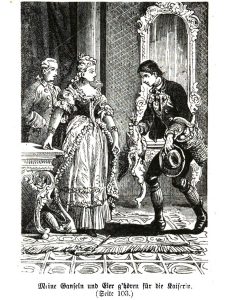 „Ein seltsamer Lärm, …, aus welchem man deutlich das Geschnatter einiger Gänse unterschieden konnte, unterbrach mit einem Male den immer heftiger werdenden Streit des Magnaten mit dem Hofzwerg. Zugleich öffnete sich eine Tapetentür der Antichambre und die Kaiserin Maria Theresia, begleitet von ihrem Sohne, dem Mitregenten Kaiser Josef II., trat majestätisch ein, neugierig nach der Ursache des ungewöhnlichen Tumults sich erkundigend.“ Im selben Augenblick stürzt ein stämmiger Bauernbursch in das Gemach und ruft: „Meine Gansl´n und Eier g´hörn für die Kaiserin!“ und diese wurden von ihroselbst natürlich gnädig und ohne Tadel für das unpassende Verhalten des Lieferanten entgegengenommen. Offenbar konnten also sowohl Krethi als auch Plethi was auch immer sie wollten – tote Tiere, Lebensmittel, Briefe, selbst geflochtene Körbe – also der gnädigen Kaiserin einfach vorbei bringen … ja, sooo wird es wohl gewesen sein!